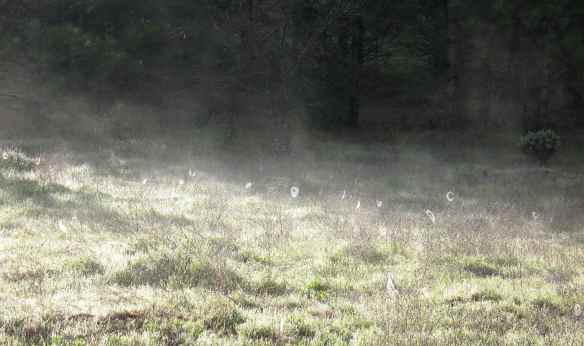 The next morning the ground was silvered with frost and my breath was clouds. Low-angled light glinted off of spiderwebs, turning them into bright Os in the grass.