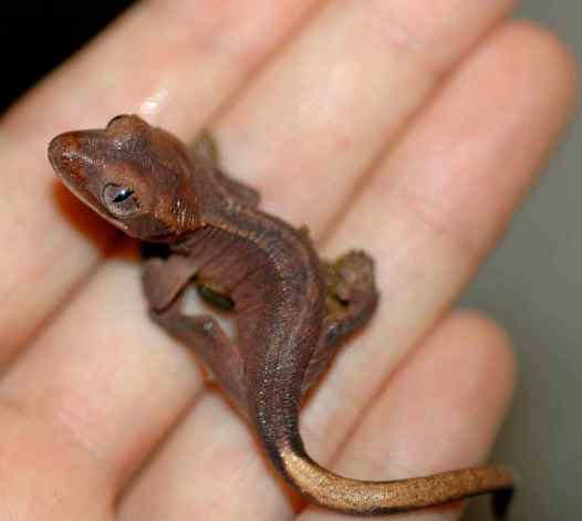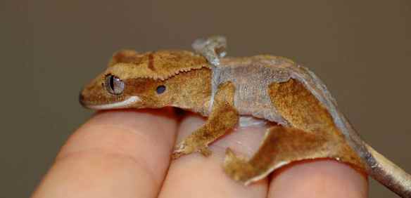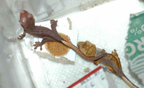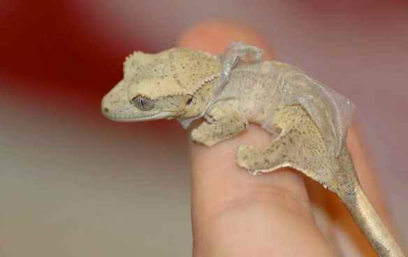 October is already exhibiting the normal crested gecko daily color change. Crested geckos are nocturnal, spending the day still and hiding. In they day they are generally lightly and dully colored.