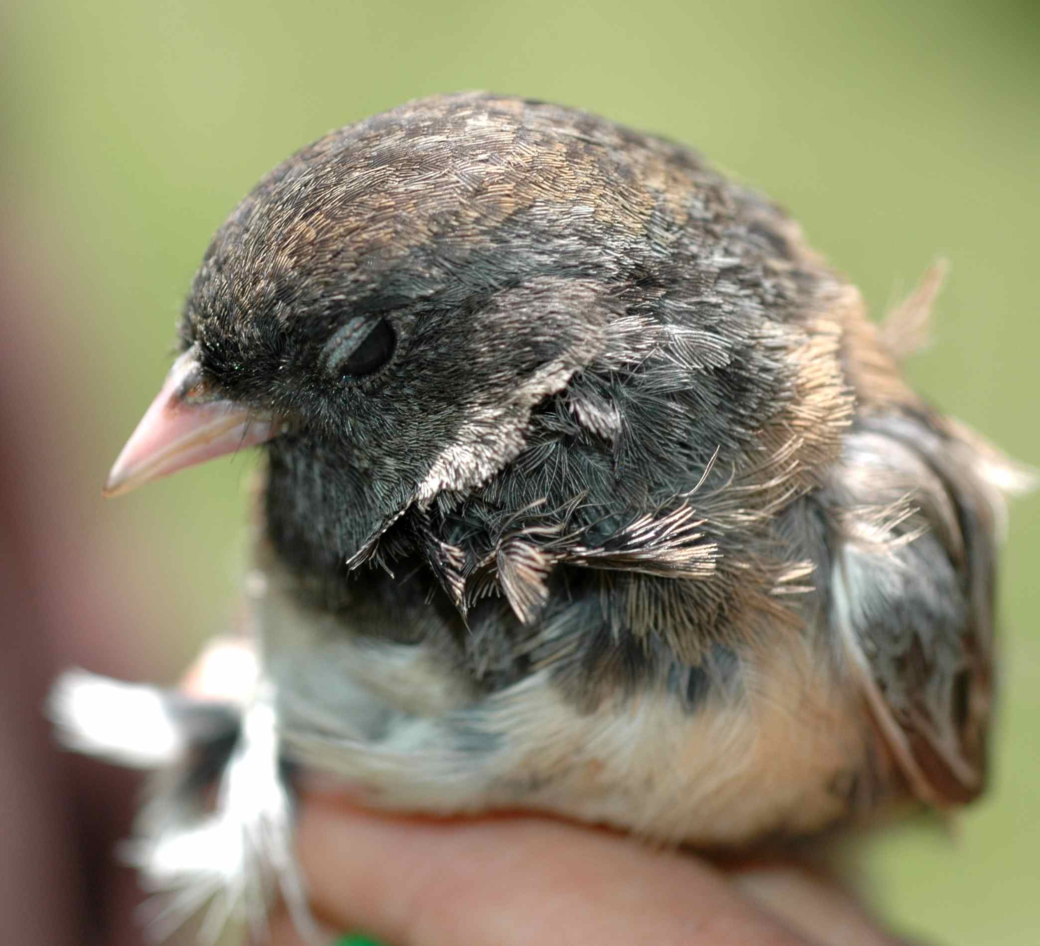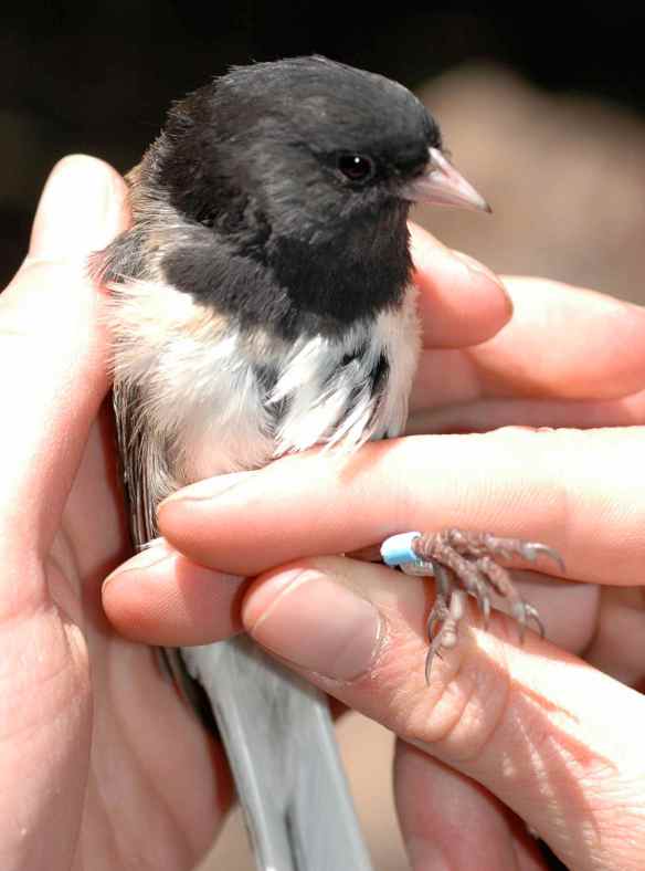 We caught them in the same location, within half an hour of each other. The first captured, ABBY, I saw foraging with male MAIS and another unbanded female immediately prior to capture. Since we saw no other juncos so close by, I think it’s very likely that our second-captured female, MAGG, was that other unbanded female.