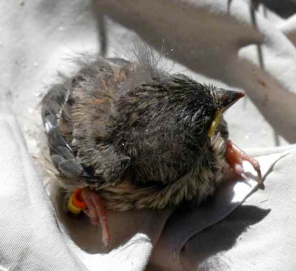Junco chicks much too young to be out of the nest. Note the bare skin and inability to do much besides sit still and eat. Photo by M. LaBarbera