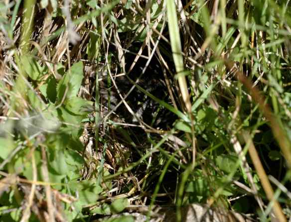 We found nest #2 when I noticed a junco scolding a hiker’s dog in the parking lot at one of our sites. I watched, and when the dog went away, the junco flew down into the brush in a small ravine at the edge of the parking lot. I approached to flush him, and there was the nest.