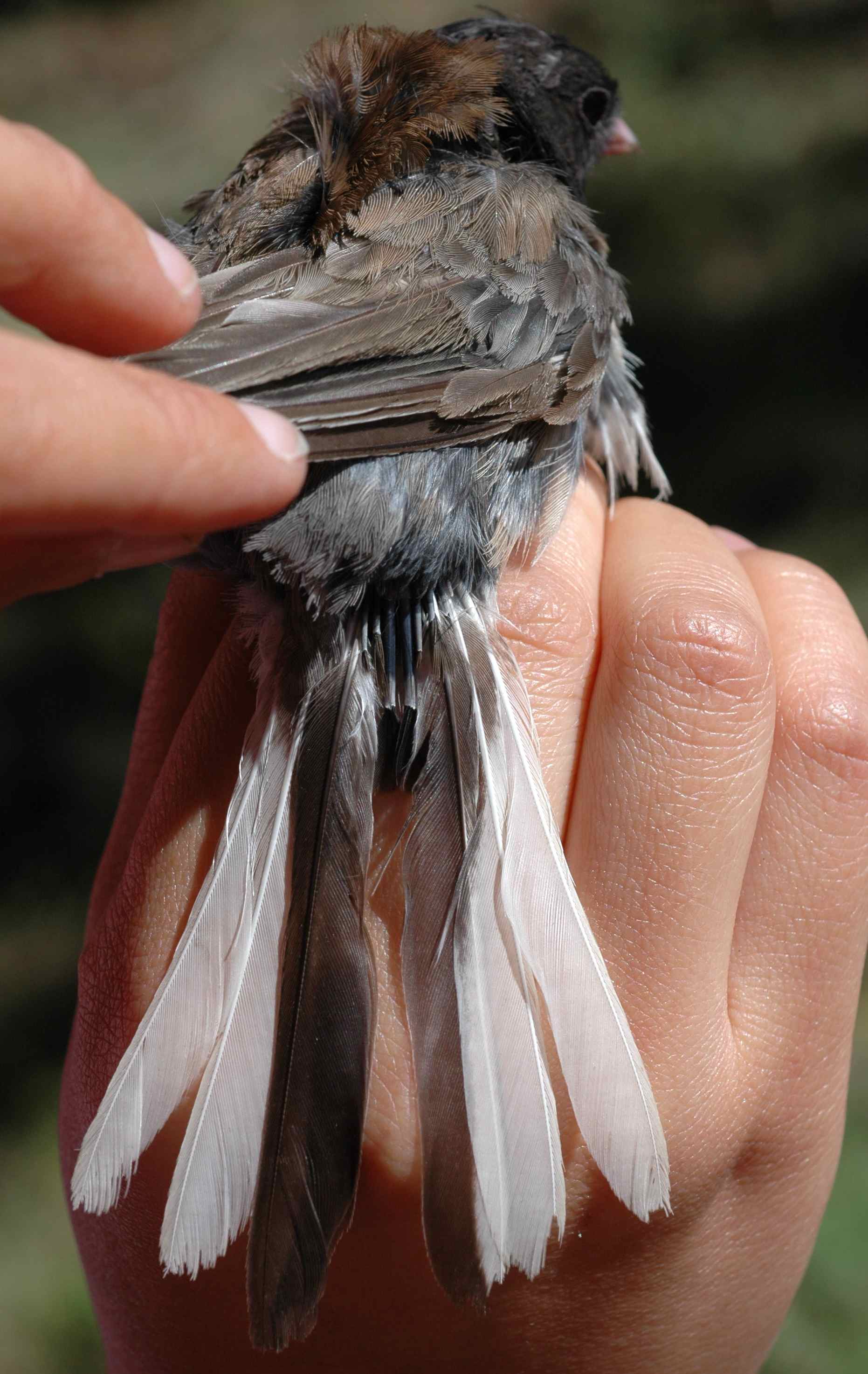 Oddly, he isn’t missing outside feathers, which are the ones we usually see missing. This might be good for him: males use the white on their tails to signal, with more white being better, so losing non-white feathers is probably better than losing white ones. But with that many tail feathers gone I wouldn’t be surprised if ROAR’s flying is less efficient.