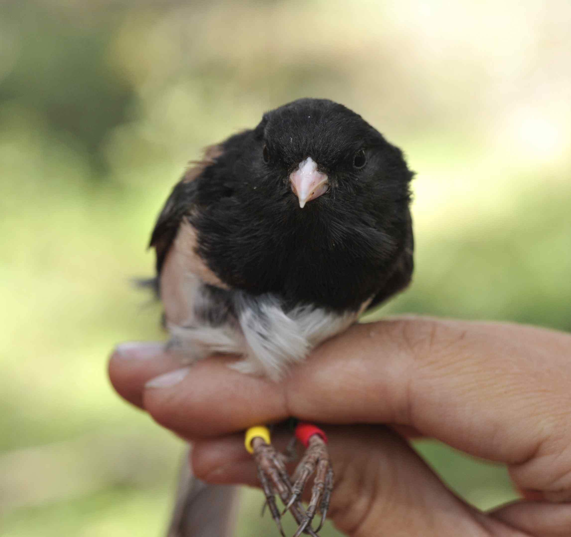 One of the things I do when I capture a junco is to collect a blood sample. I use a sterile needle, collect very little blood, and don’t let the bird go until I’m sure the bleeding has stopped. The birds usually don’t even flinch. They act much more upset when I blow on their chests to look for brood patches (I think it feels cold to them) than they do when I take blood.