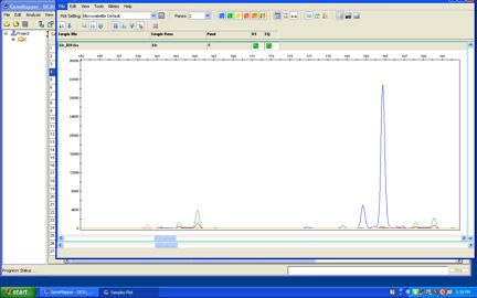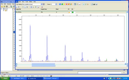 Once I have the DNA I do PCR (Polymerase Chain Reaction) which is a method by which we can create lots and lots of copies of certain pieces of DNA. In my case I make lots of copies of long, repetitive sequences called microsatellites. They might look like: ATCATCATCATCATC…. on and on for 100-300 base pairs.