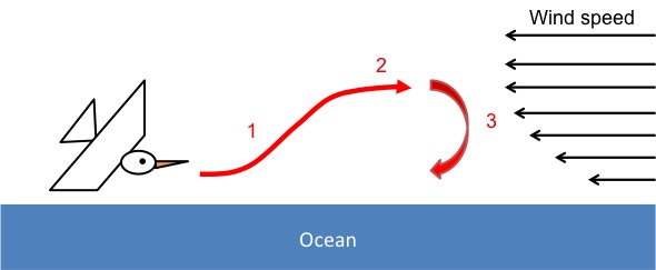 At point (1) on the diagram, the albatross is near the water’s surface and flying towards the wind and upward. It’s losing speed, since it’s flying into the wind. However, once it gets high enough that the wind is quite fast (2), it turns around and goes with the wind as far as the energy of that fast wind can take it, gradually falling back towards the water (3). When it gets low again, it turns toward the wind, and the cycle repeats.
