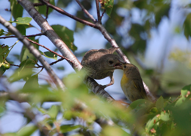 Cowbird fledgling being fed by its Common Yellowthroat foster parent.