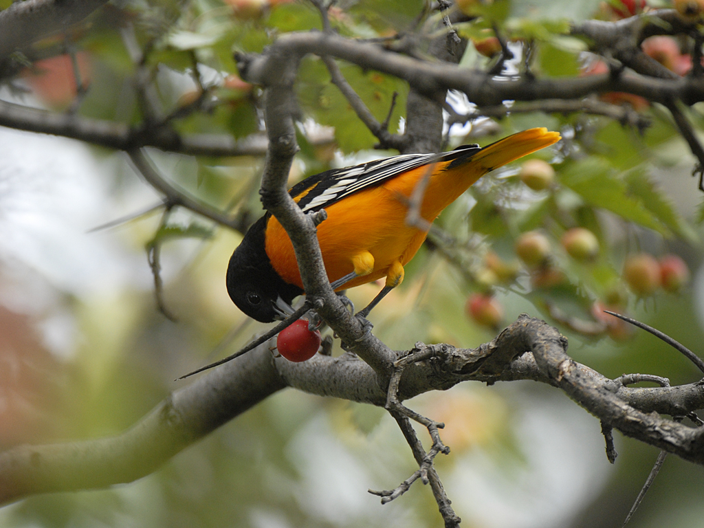 That berry may contain carotenoids to help this male Baltimore Oriole stay orange.
