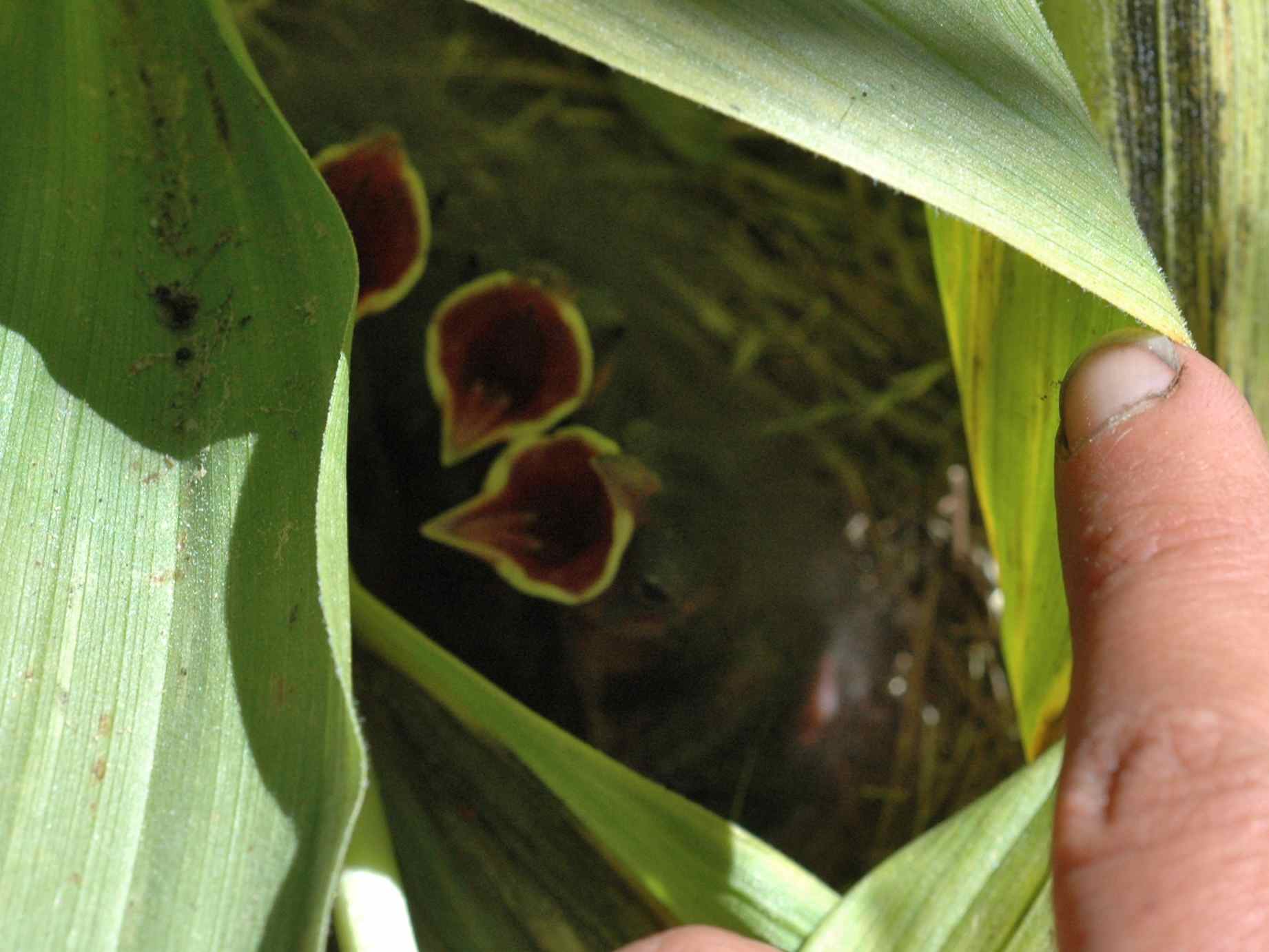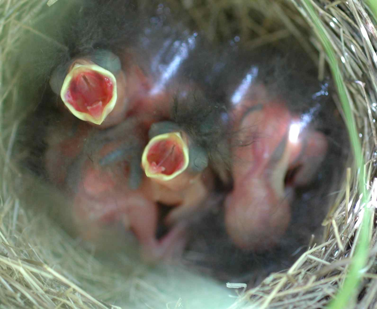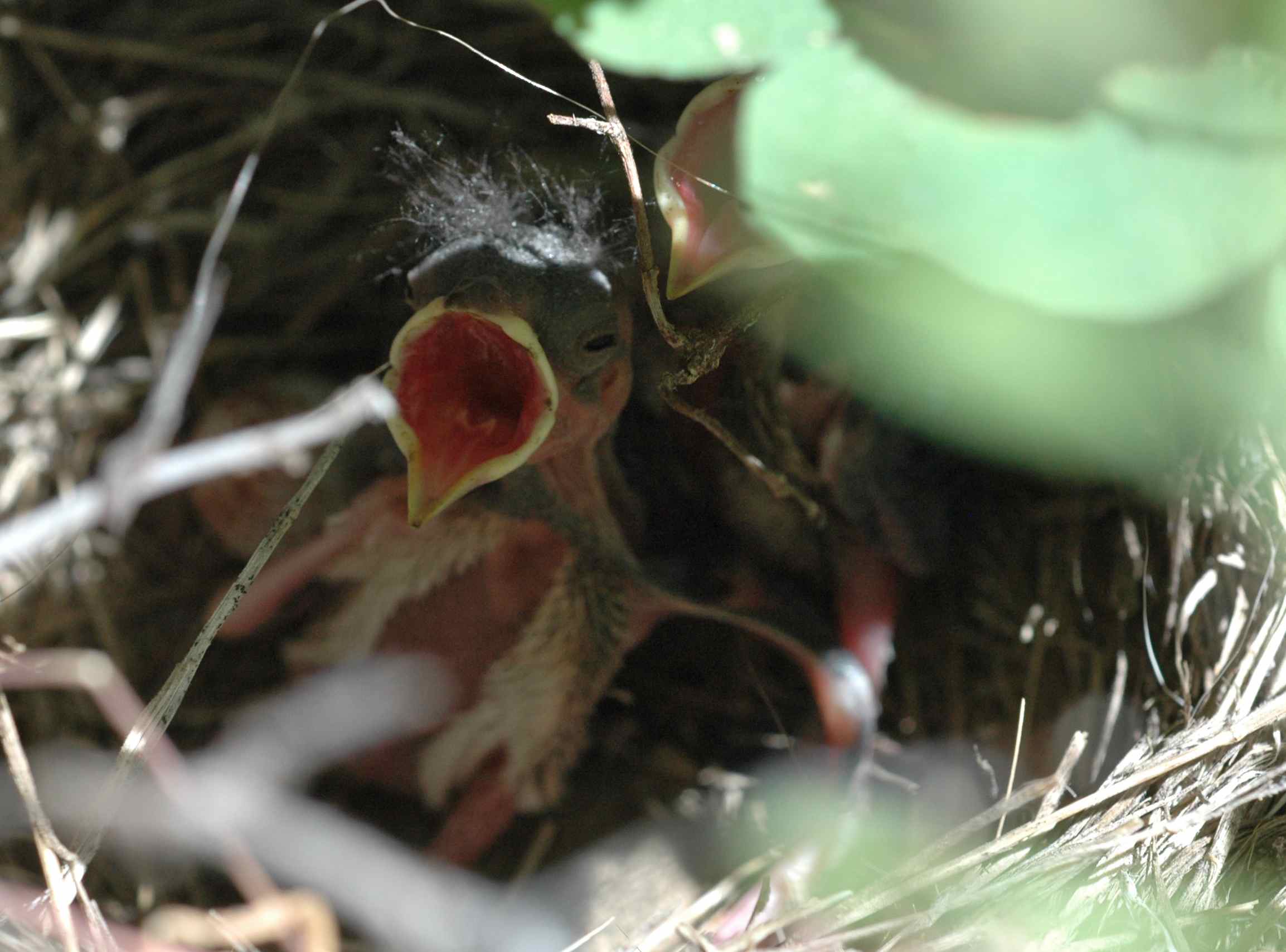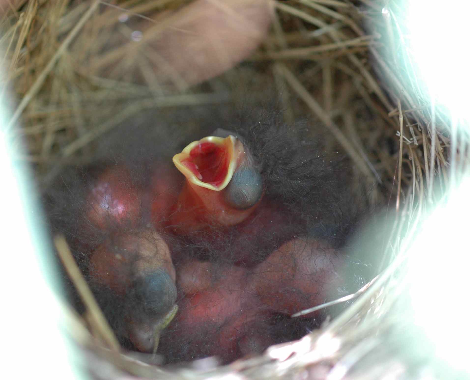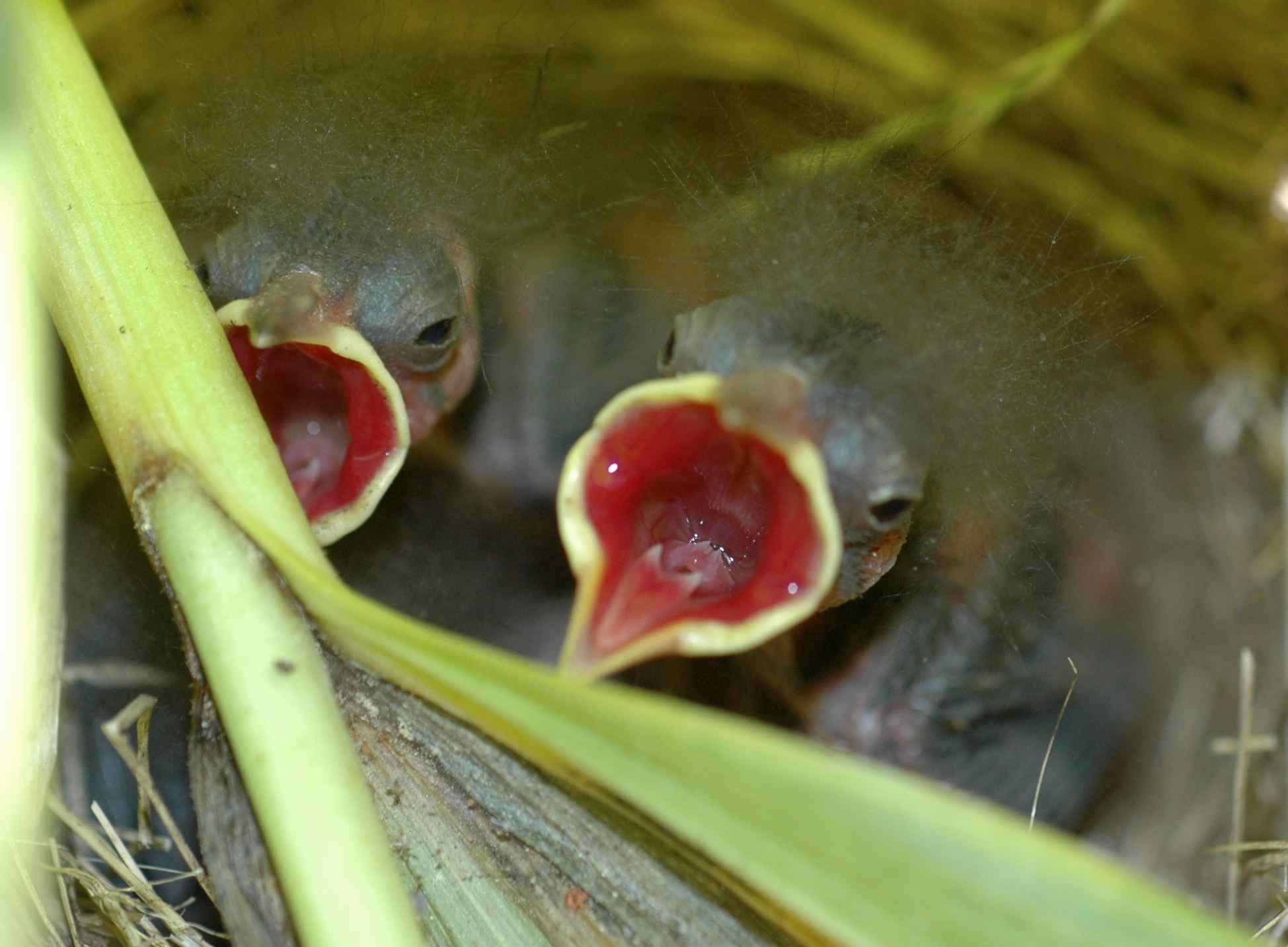 The gape is also pretty good for size comparison. The nest below has one chick that is a bit smaller than its siblings, and you can see easily here which of the two gaping babies is the runt: