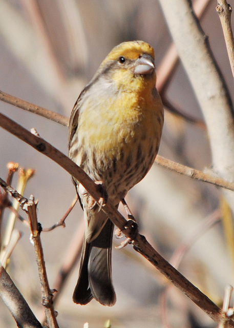 Male House Finches come in several colors, from the most familiar red shading through orange to bright golden yellow. They use carotenoids acquired from their diet to make these bright colors, and the colors are a sexual trait used to attract female mates.
