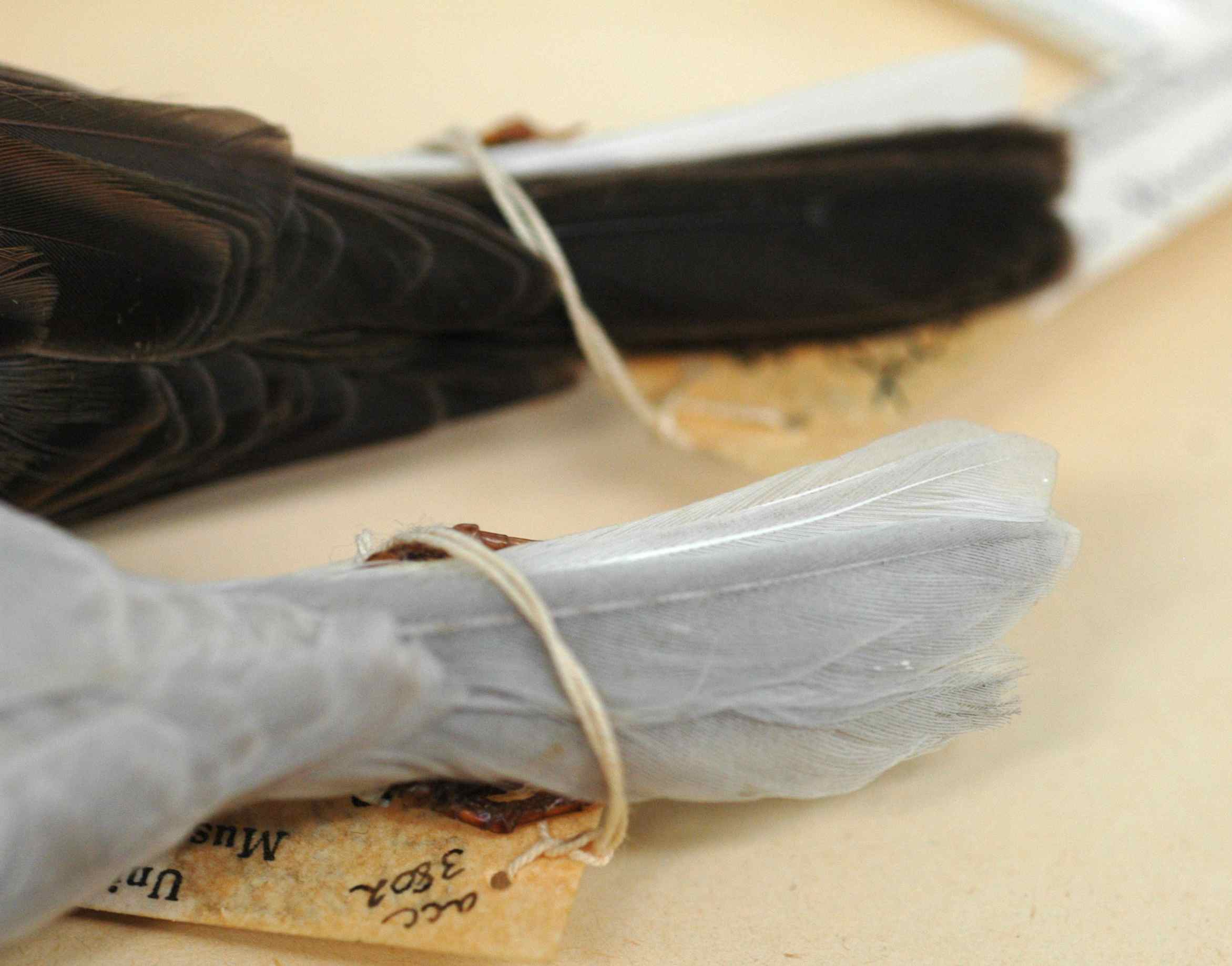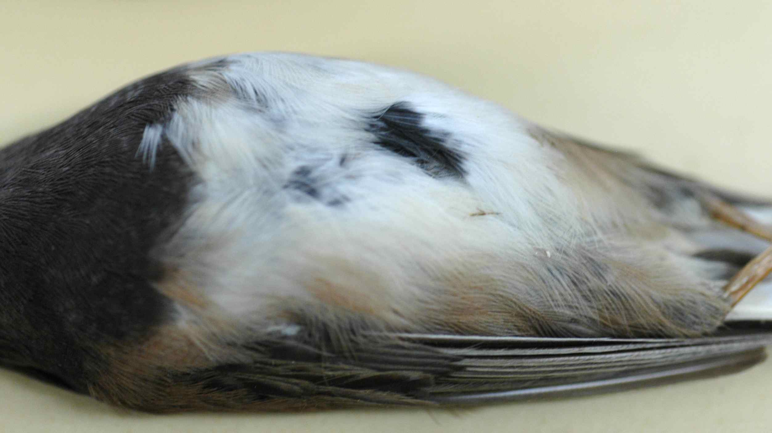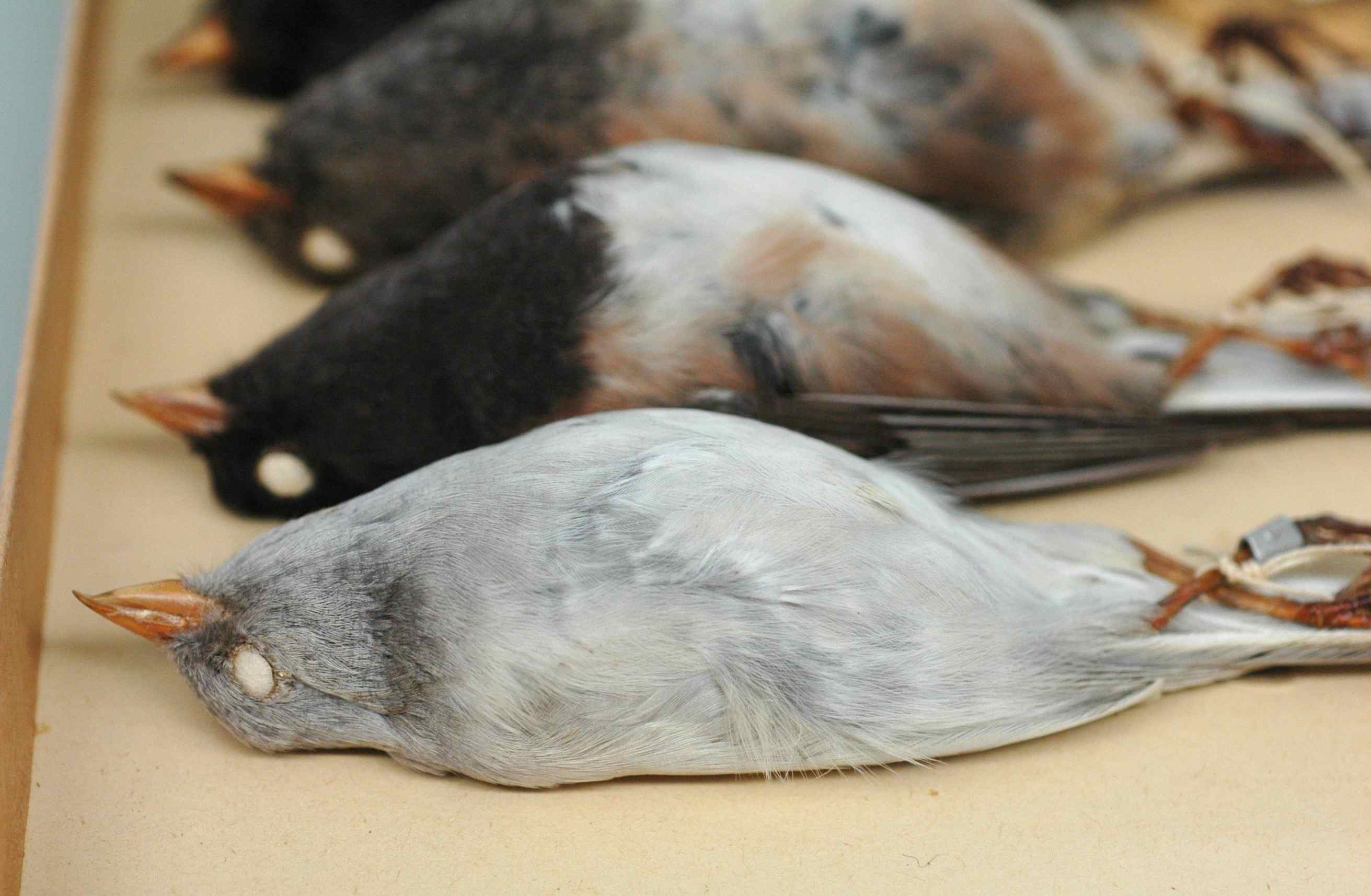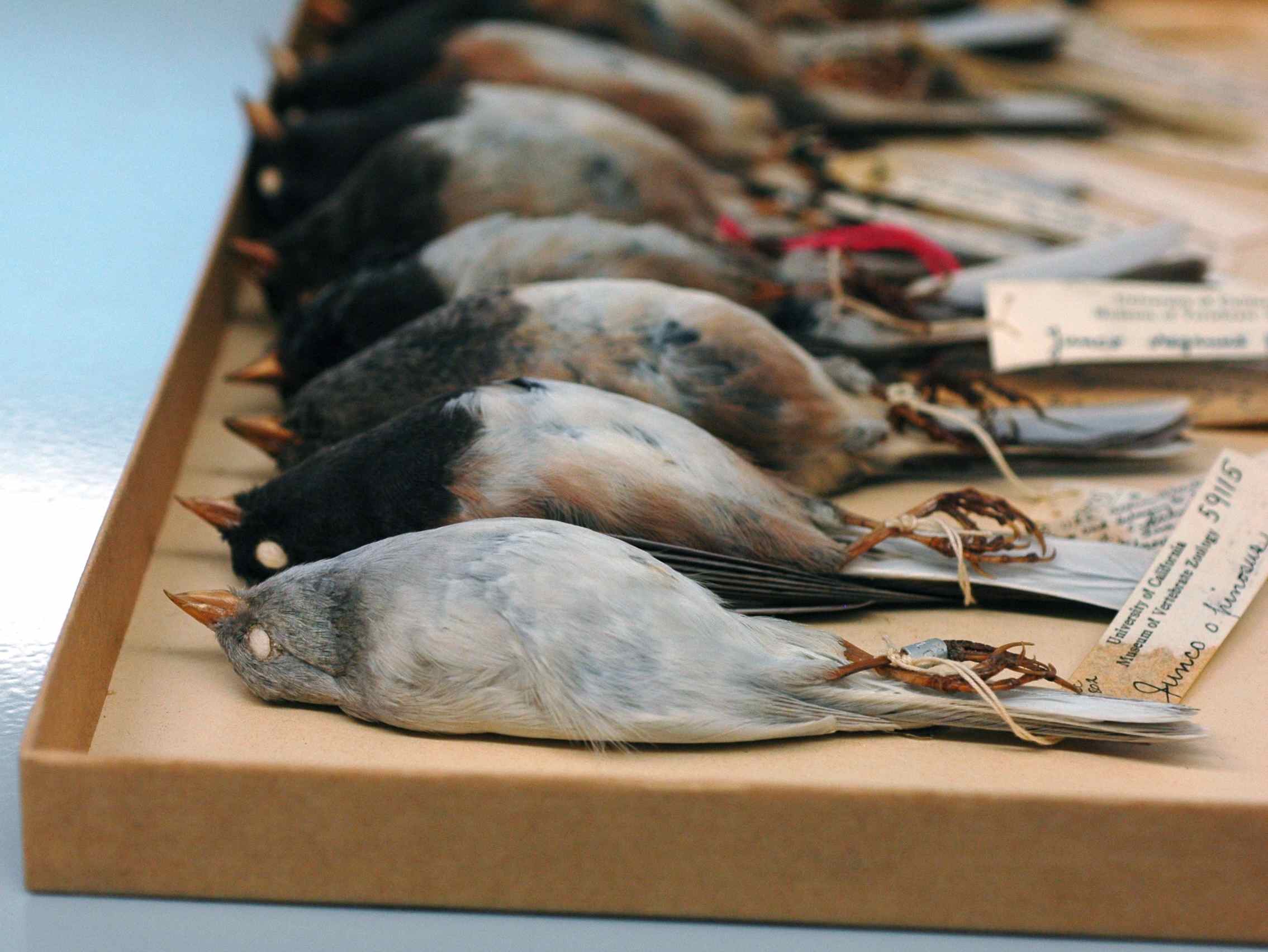 You might think he’s purely colorless at first glance, but he isn’t. He’s more blue-silver than white, an incredible color to come shining out of a drawer of junco specimens when you’ve just spent the last few weeks measuring the same brown-and-black birds over and over. When you look close you find that hidden in those pale feathers are the whispers of normal junco coloration.