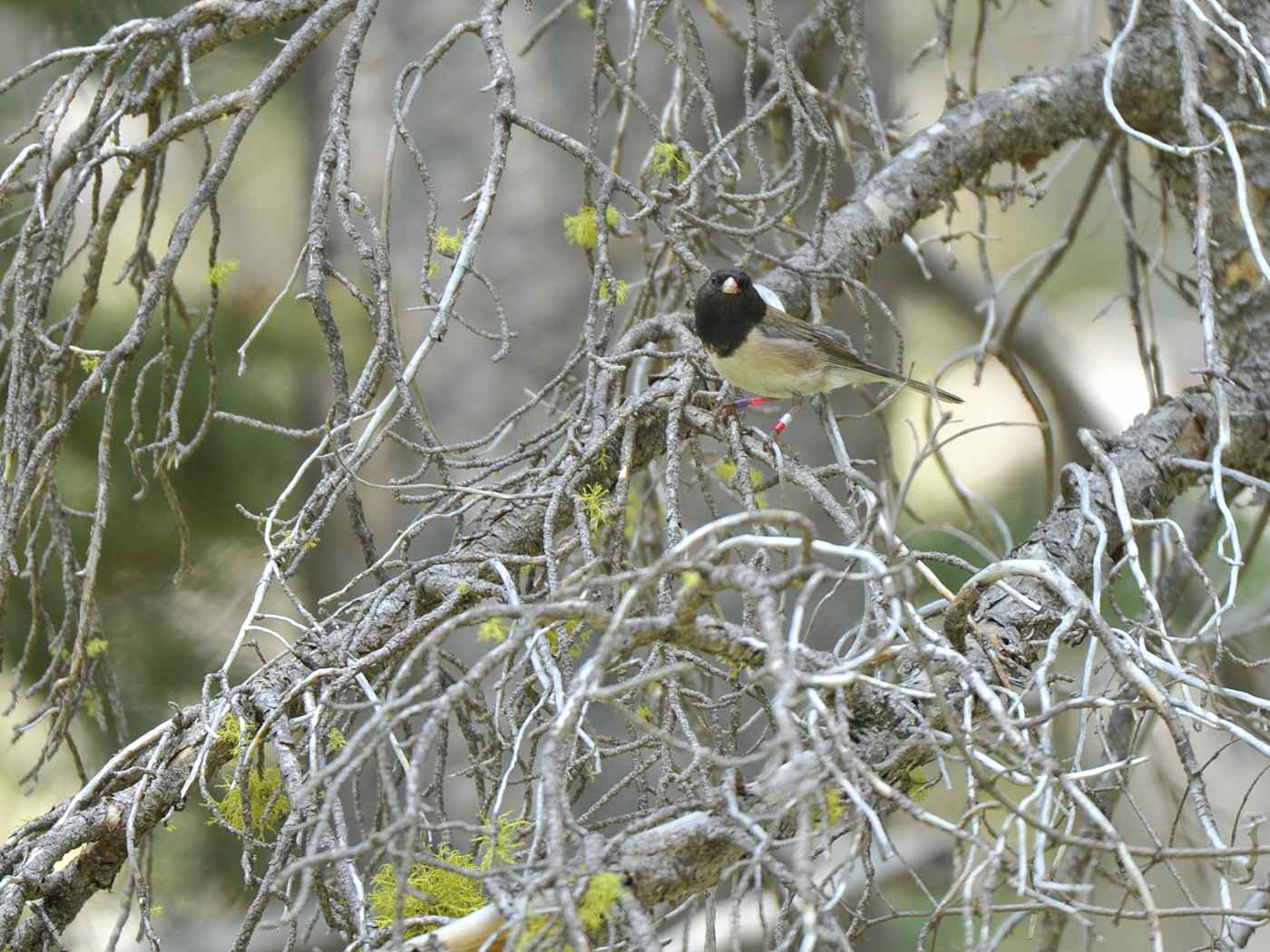 An already-banded male, ARKM, seemed very upset about this. Sometimes juncos do hang around when we band their mates—it’s rather sweet to see them reunite when the banded birds are released—but ARKM’s behavior seemed different to me, so after we released MABY, I lurked behind a tree and watched.