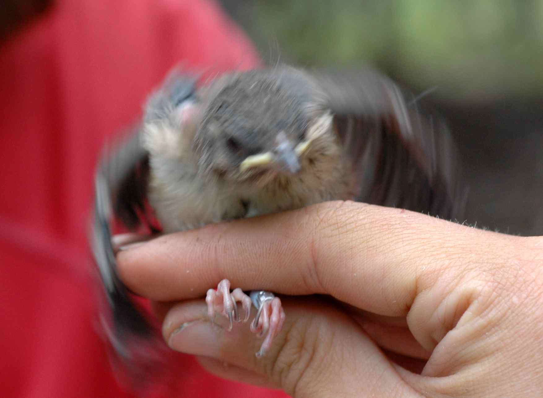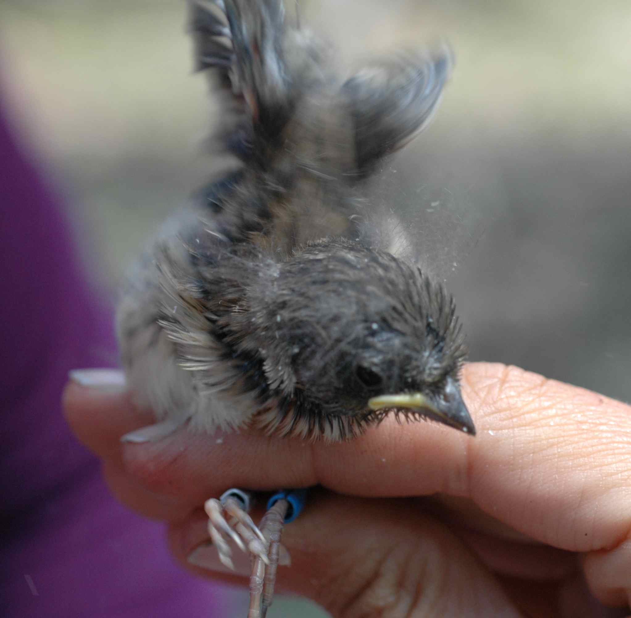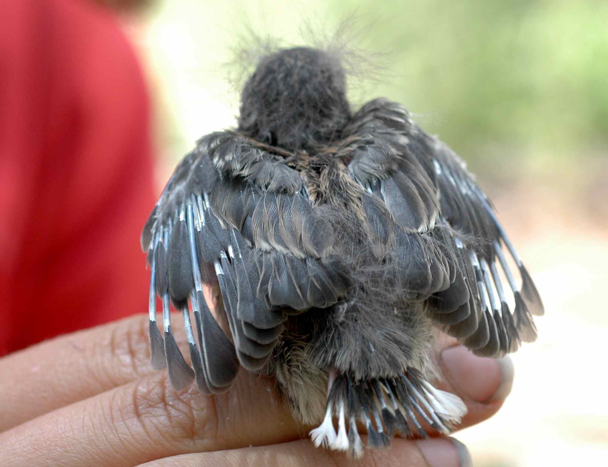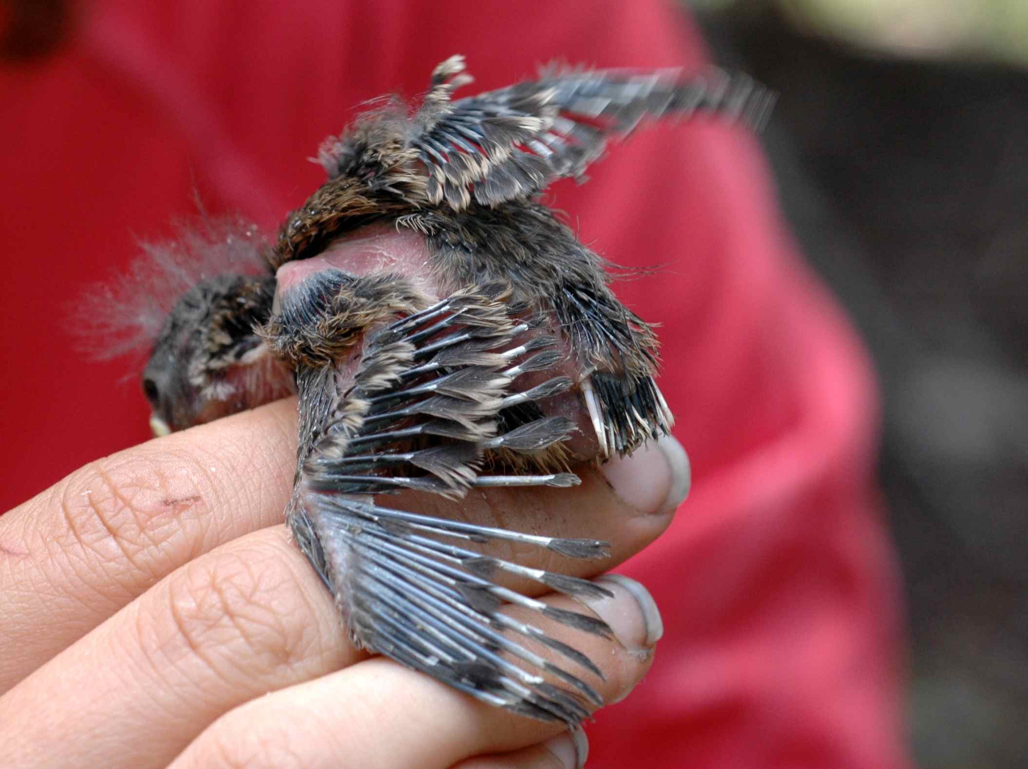 Why do I have these photos? Because we try to photograph every nestling and fledgling to get a sense of their age and development. The feathers in their tails, wings, and along the feather tracts on their bellies and backs all grow in quickly at this stage, giving you information about the age (or, if you know the age, the development for its age) of the bird.