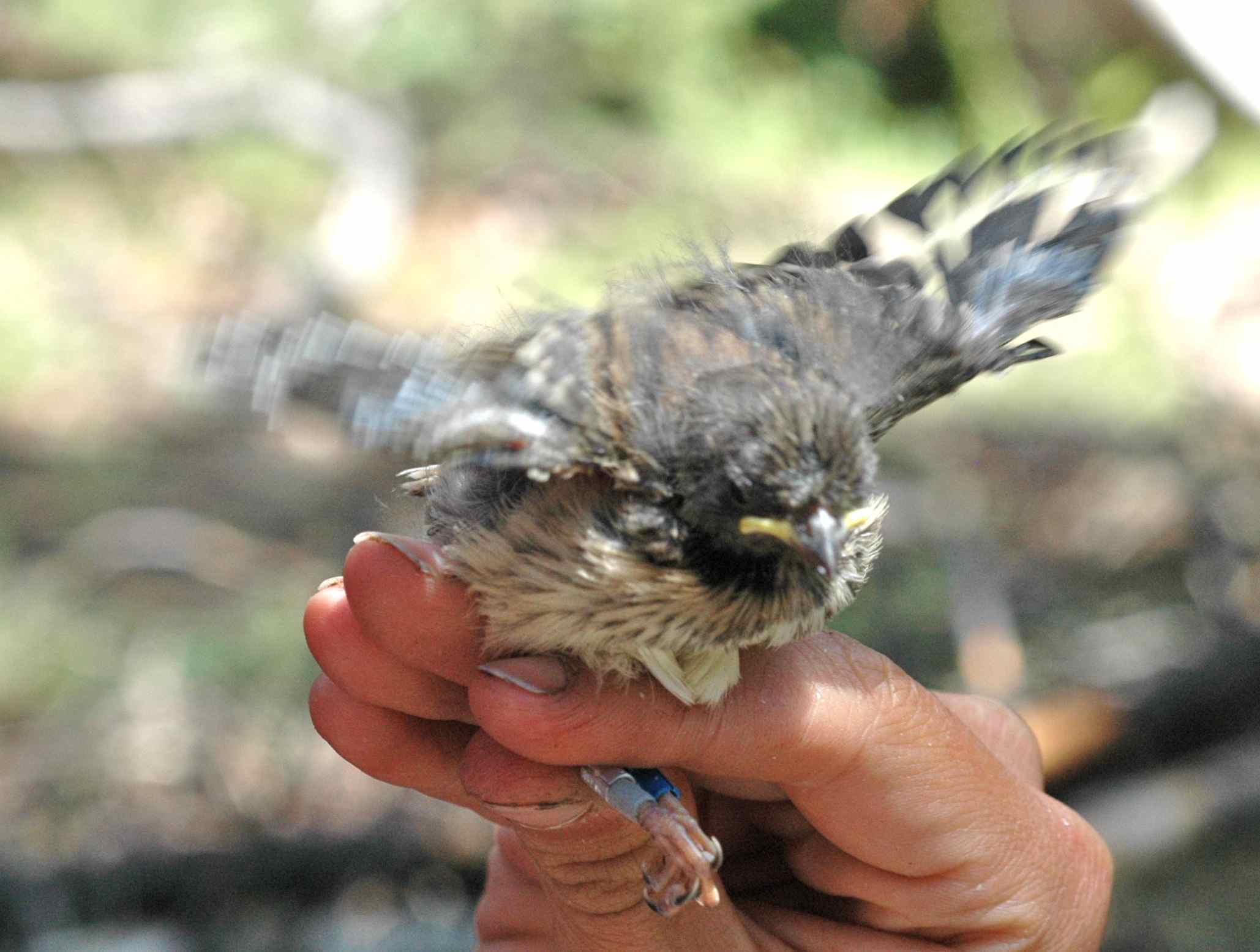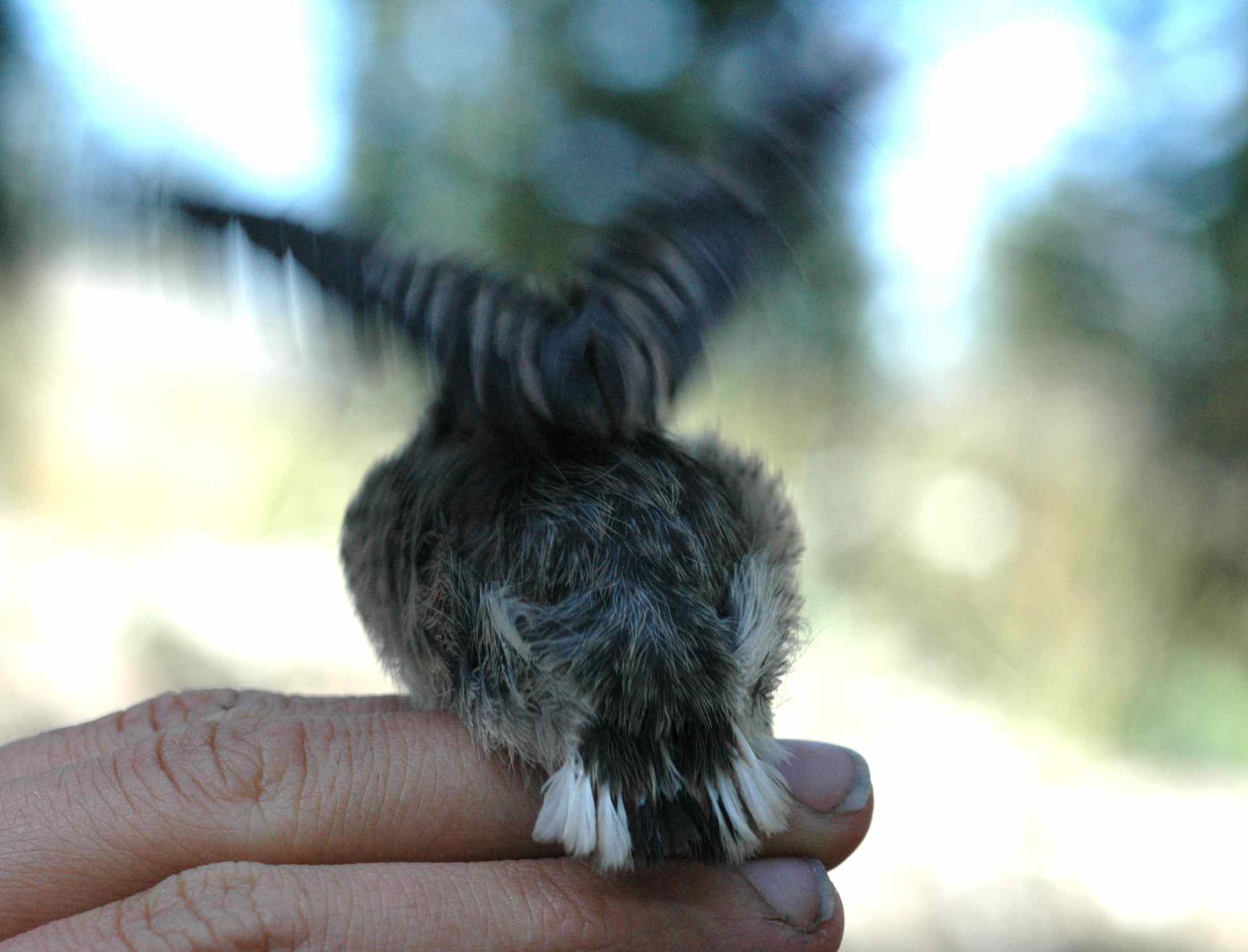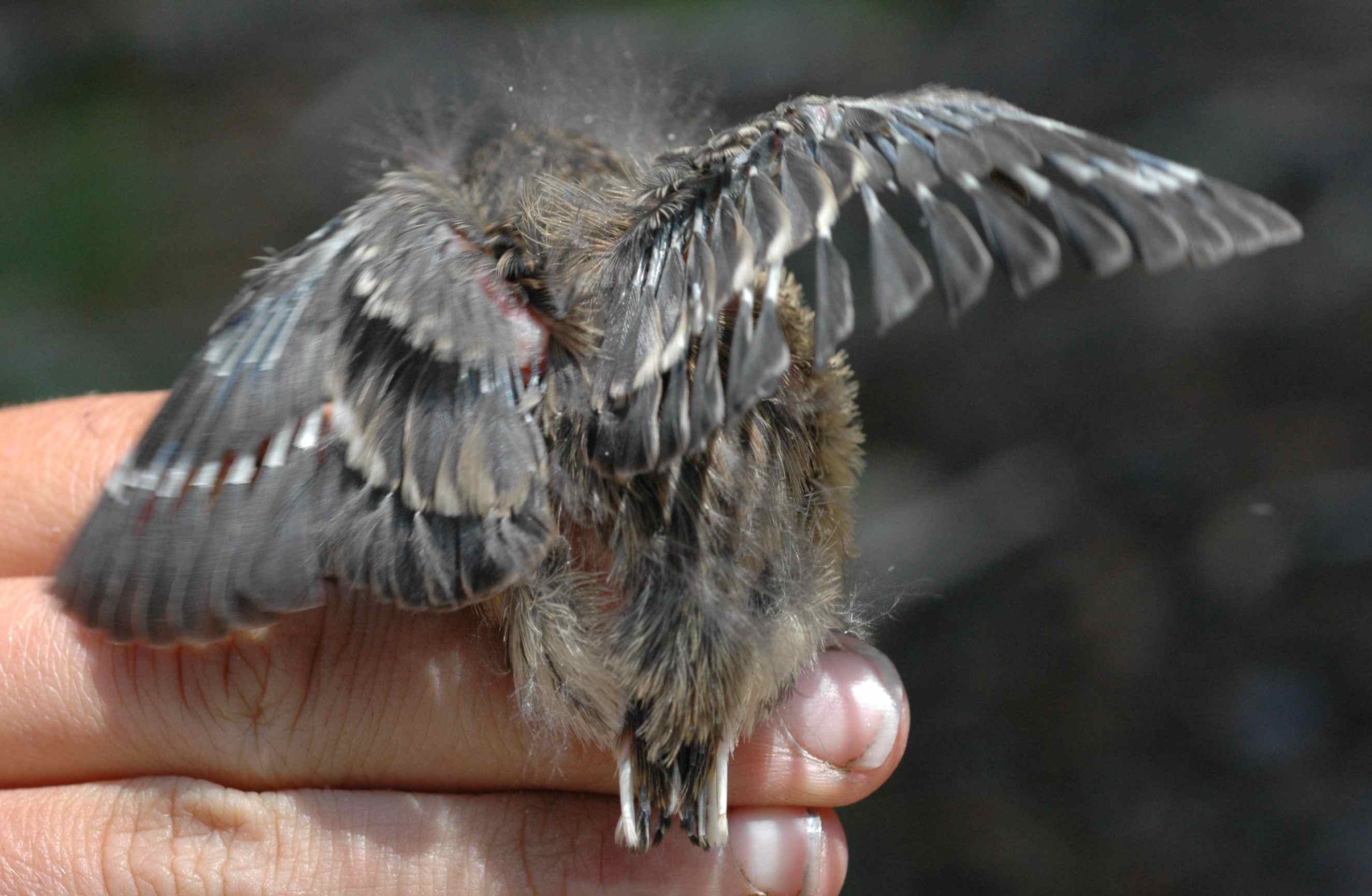 Why do I have these photos? Because we try to photograph every nestling and fledgling to get a sense of their age and development. The feathers in their tails, wings, and along the feather tracts on their bellies and backs all grow in quickly at this stage, giving you information about the age (or, if you know the age, the development for its age) of the bird.