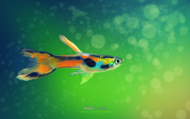 Male guppy (some sort of domestic hybrid, but displaying the kind of color patches that wild male guppies have). Photo by Chantal Wagner Kornin*
