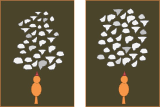 Left: normal perspective, if all the objects were actually the same size, would make the farther objects appear smaller. Right: since the objects are arranged by size to counteract the effect of perspective, they all appear to be the same size to the female.