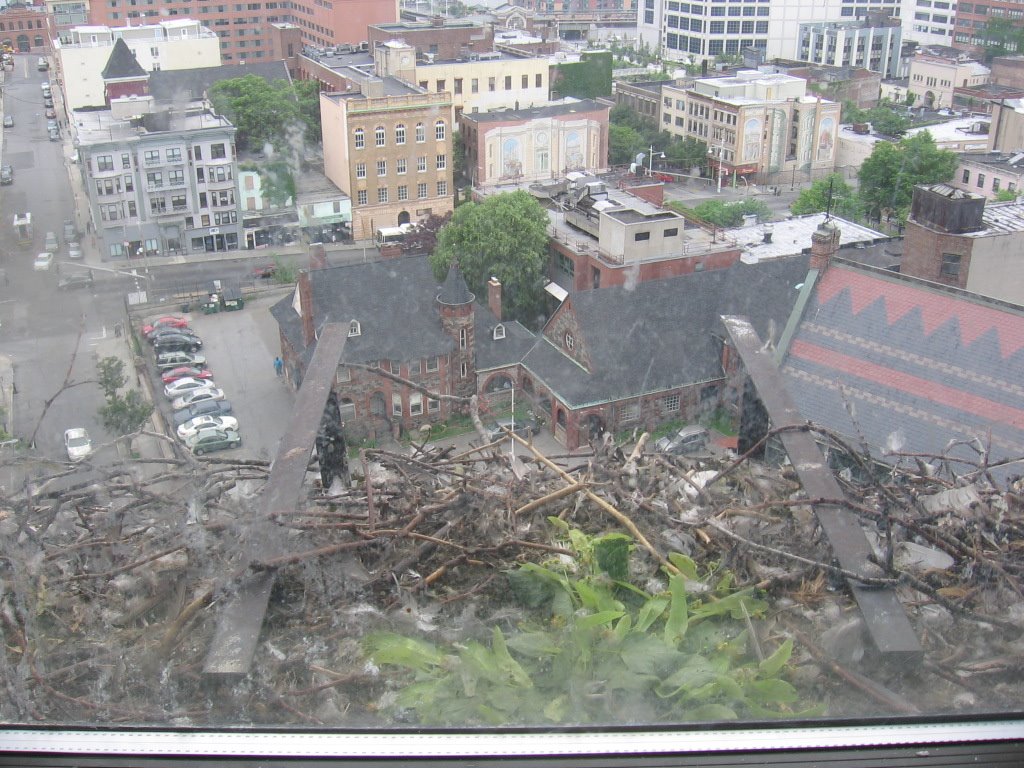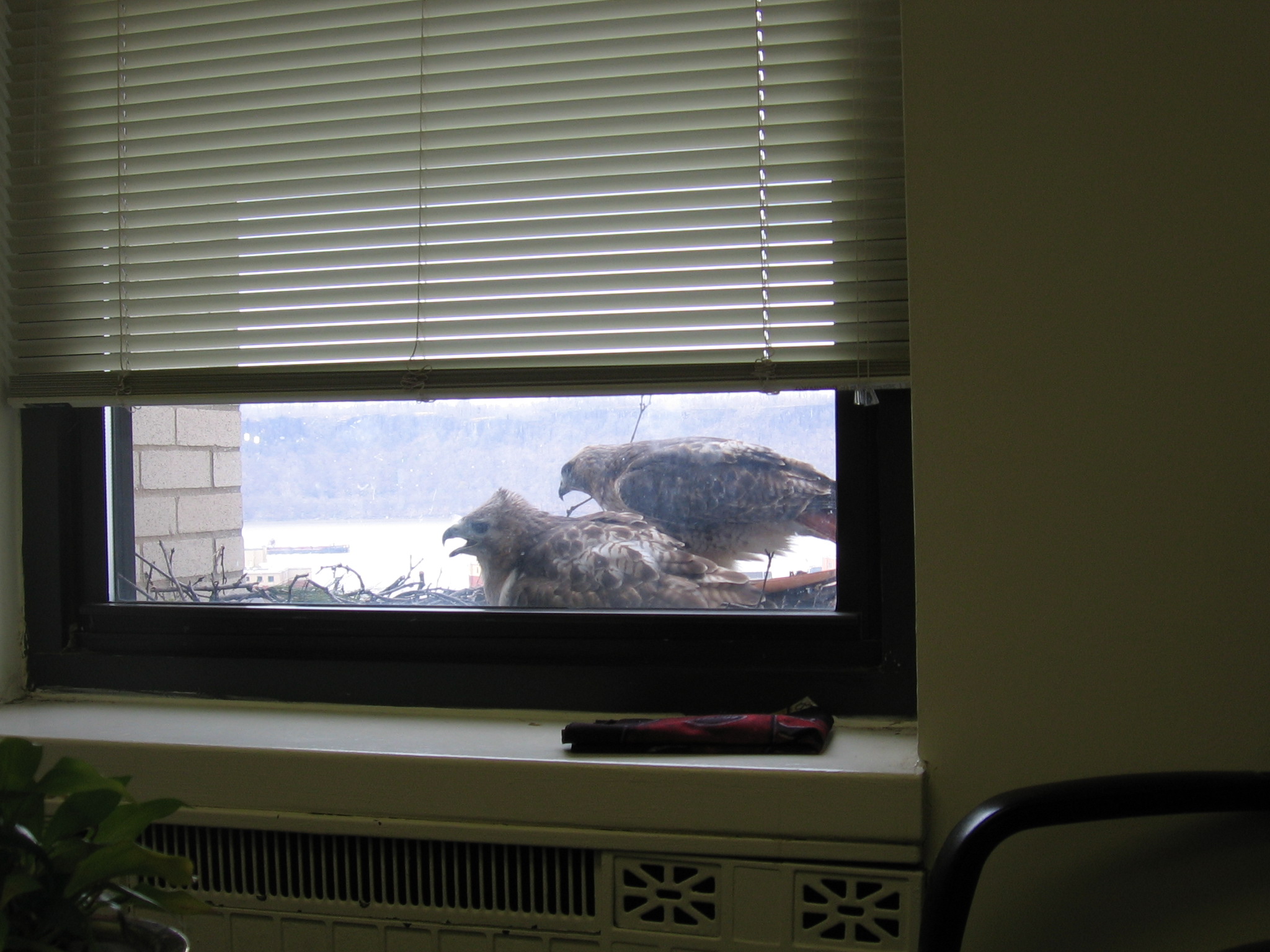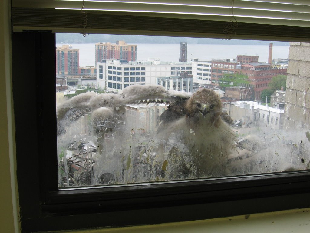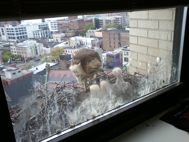 In February, a pair of Red-tailed Hawks began to build a nest in the window of a tenth-floor conference room in Yonkers, NY. Over the next four months, Jerry and Beverly—who work in that office—watched and documented the red-tails as they raised their chicks. Many thanks to Jerry and Beverly for agreeing to share their photos and videos, and thanks to James for passing them on to me!