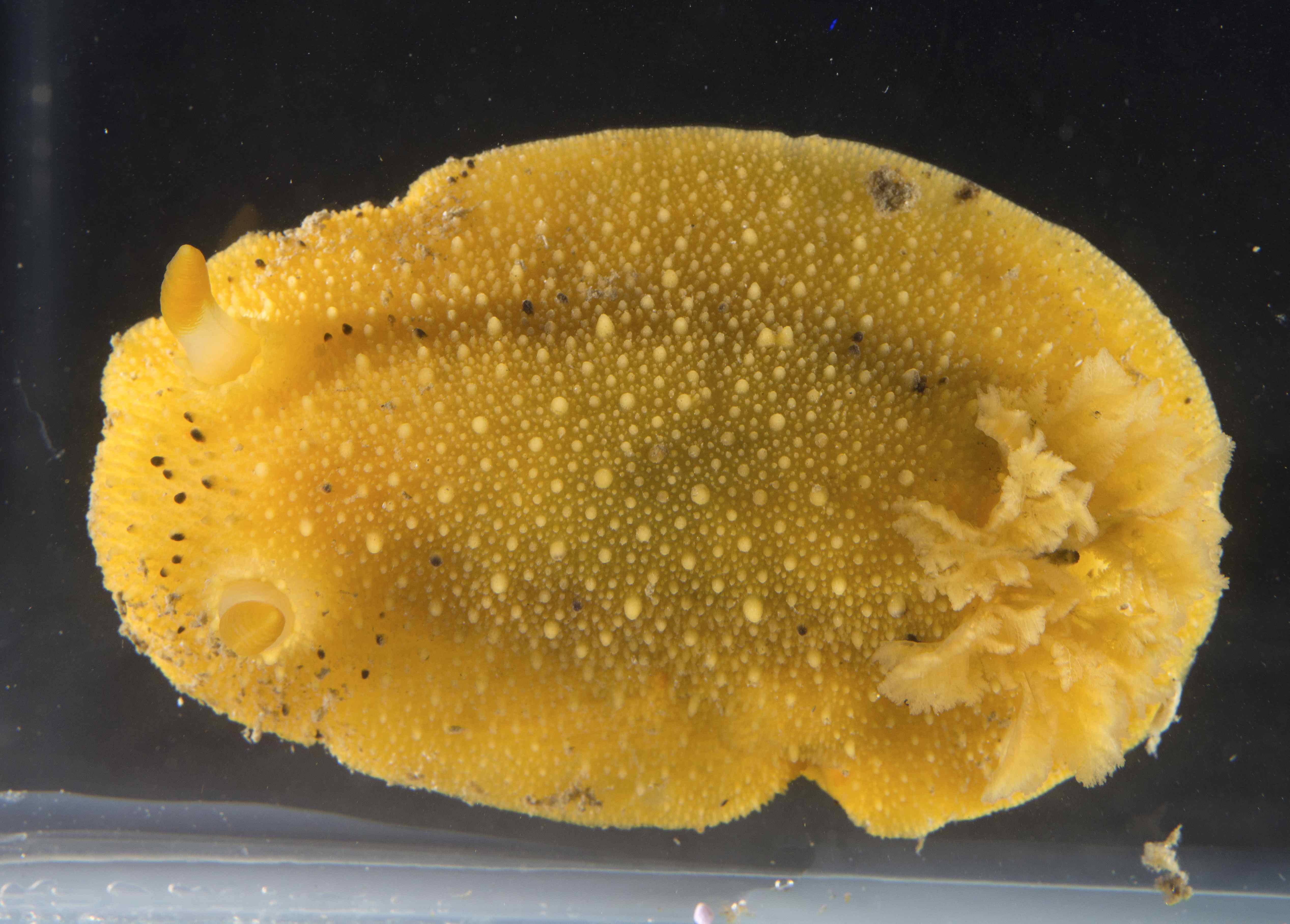 Doris montereyensis. This nudibranch will be cryptic on the bumpy yellow sponge it likes to eat, but bright and obvious elsewhere. Photo by M. LaBarbera