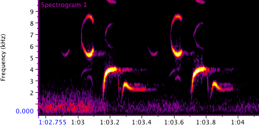 In the field, if a vocalization is 5500 Hz or higher, I usually can’t hear it. I don’t have much sound sensitivity or discrimination – a visual equivalent would be near-sightness. People or things close to me I can understand passably well, but the further away or quieter a sound is, it becomes “blurry” – I can’t pick it out of the surrounding sound, which is noticeable but incomprehensible.