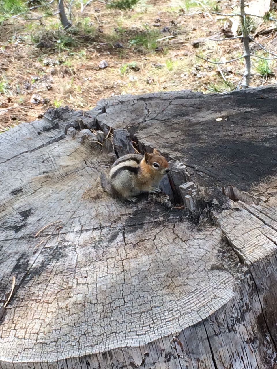A golden-mantled ground squirrel on a tree stump is warm too.